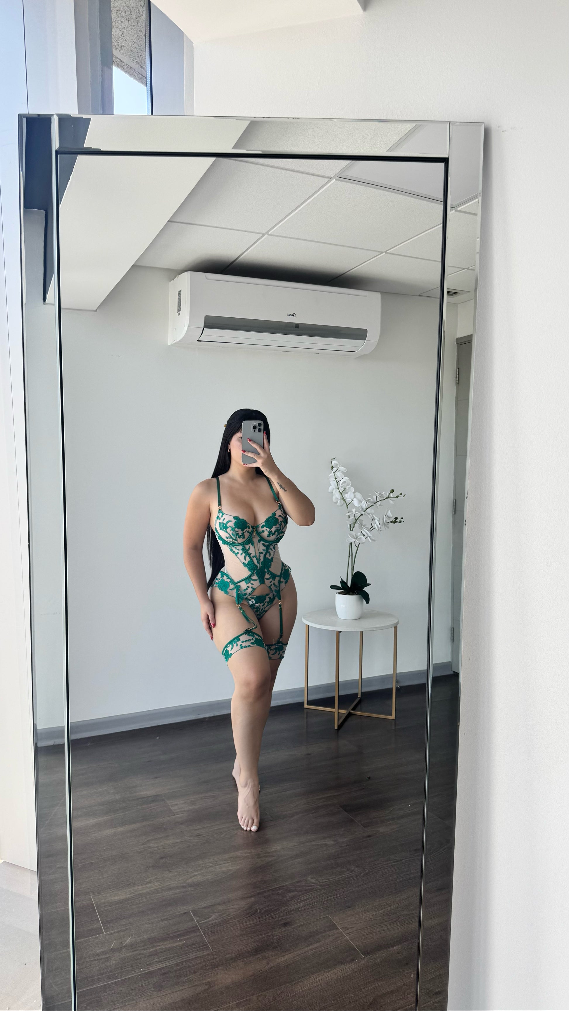 Este conjunto tipo body con ligueros integrados combina encaje floral bordado con transparencias estratégicas que realzan la silueta, estilizan la cintura y destacan las curvas con sofisticación. Su color rojo profundo transmite pasión y seguridad, ideal para mujeres que saben lo que quieren.
